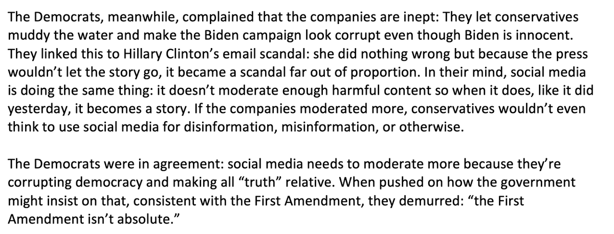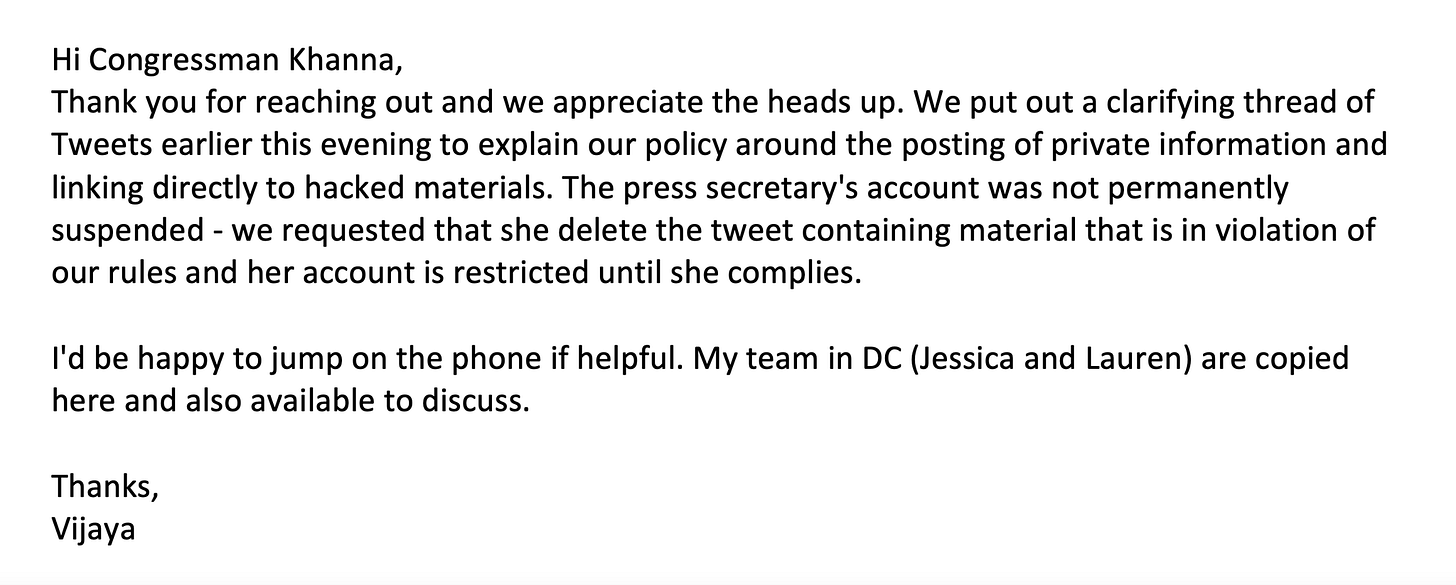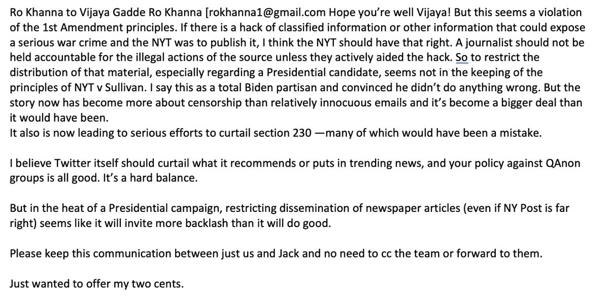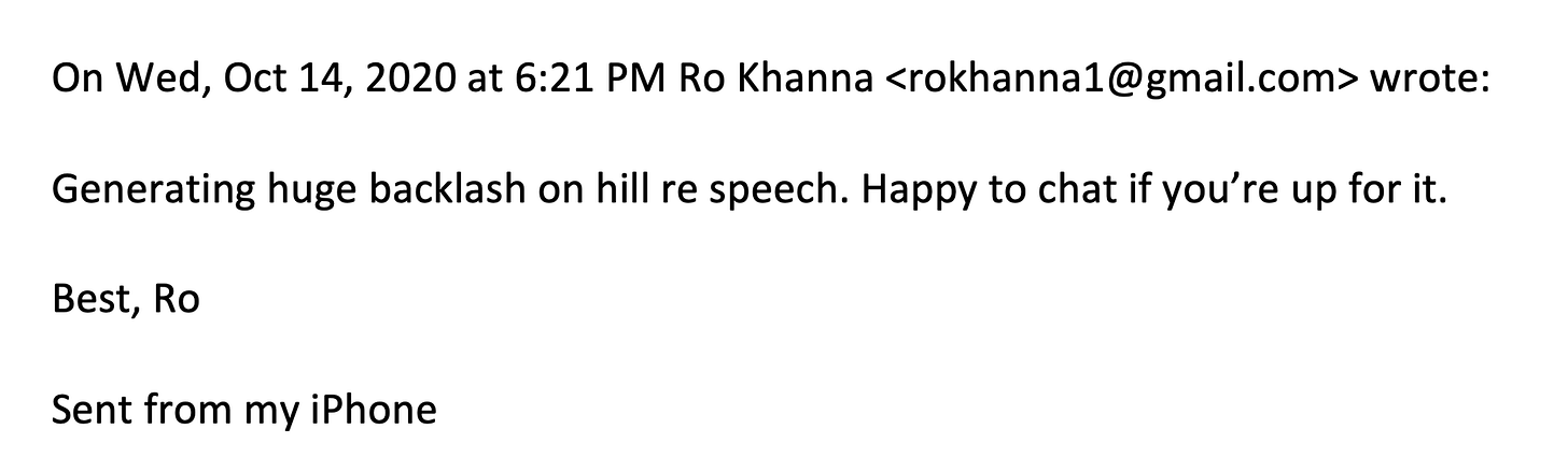 A fundamental problem with tech companies and content moderation: many people in charge of speech know/care little about speech, and have to be told the basics by outsiders. To wit: In one humorous exchange on day 1, Democratic congressman Ro Khanna reaches out to Gadde to gently suggest she hop on the phone to talk about the “backlash re speech.” Khanna was the only Democratic official I could find in the files who expressed concern.