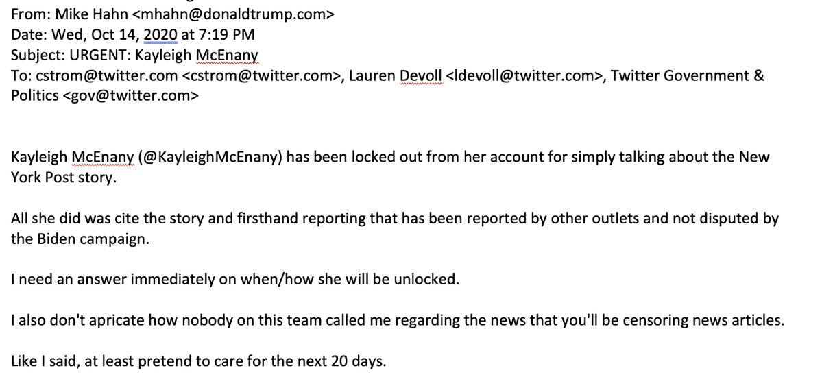 Twitter took extraordinary steps to suppress the story, removing links and posting warnings that it may be “unsafe.” They even blocked its transmission via direct message, a tool hitherto reserved for extreme cases, e.g. child pornography. White House spokeswoman Kaleigh McEnany was locked out of her account for tweeting about the story, prompting a furious letter from Trump campaign staffer Mike Hahn, who seethed: “At least pretend to care for the next 20 days.”
