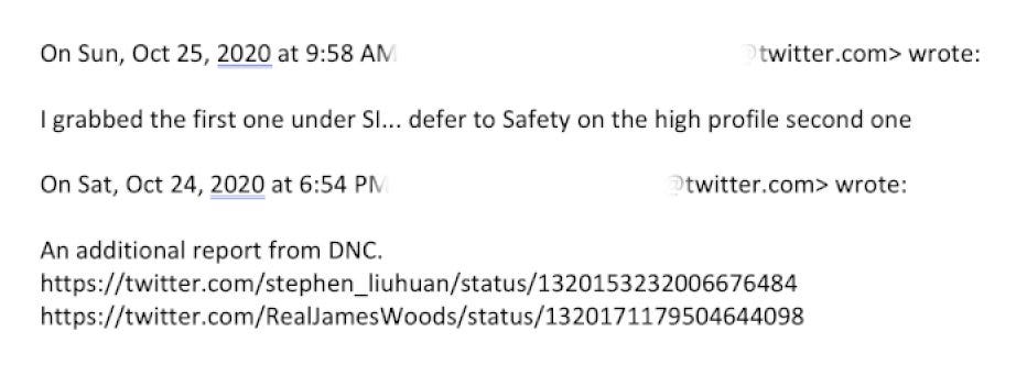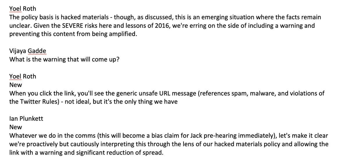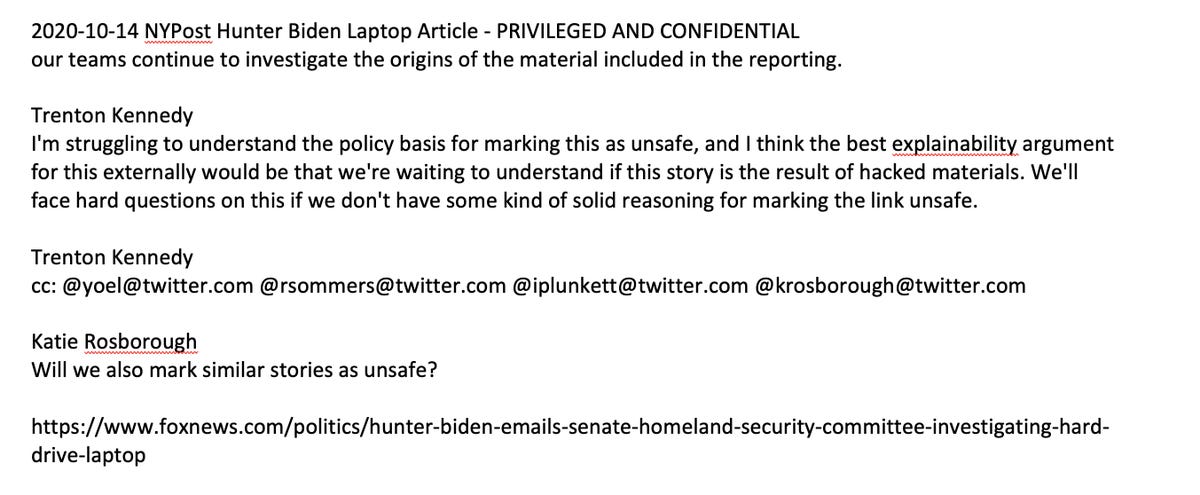 “They just freelanced it,” is how one former employee characterized the decision. “Hacking was the excuse, but within a few hours, pretty much everyone realized that wasn’t going to hold. But no one had the guts to reverse it.” You can see the confusion in the following lengthy exchange, which ends up including Gadde and former Trust and safety chief Yoel Roth. Comms official Trenton Kennedy writes, “I'm struggling to understand the policy basis for marking this as unsafe”: