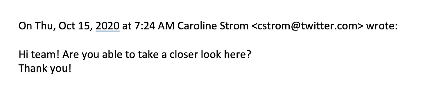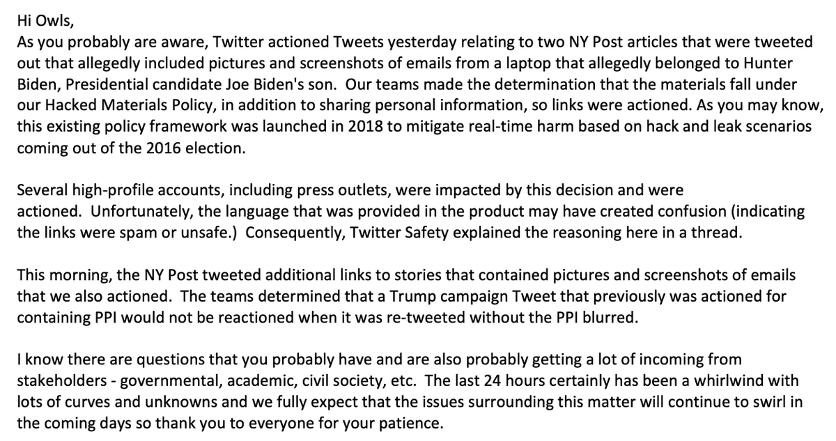 There are multiple instances in the files of Dorsey intervening to question suspensions and other moderation actions, for accounts across the political spectrum. The problem with the "hacked materials" ruling, several sources said, was that this normally required an official/law enforcement finding of a hack. But such a finding never appears throughout what one executive describes as a "whirlwind" 24-hour, company-wide mess.