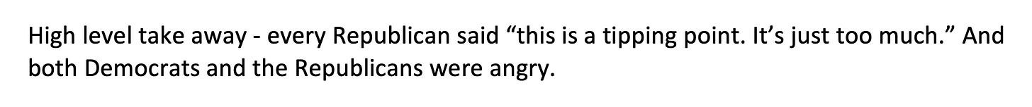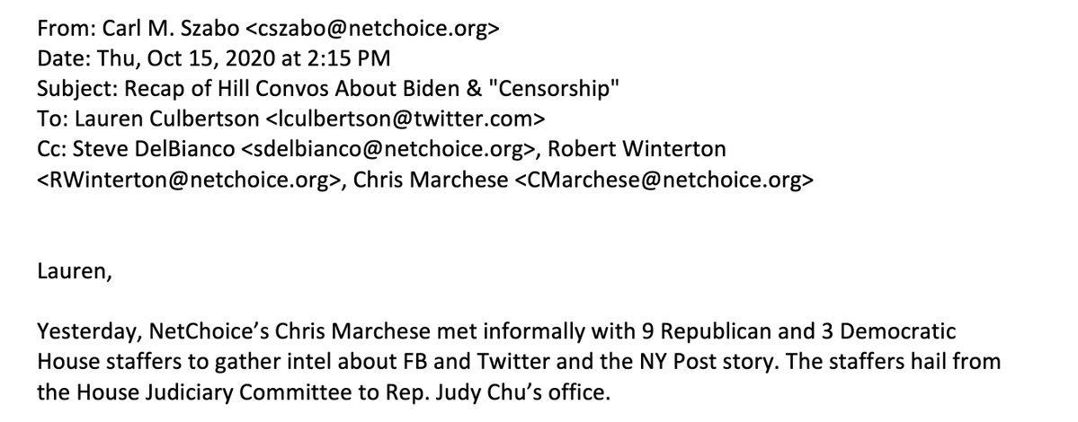 Within a day, head of Public Policy Lauren Culbertson receives a ghastly letter/report from Carl Szabo of the research firm NetChoice, which had already polled 12 members of congress – 9 Rs and 3 Democrats, from “the House Judiciary Committee to Rep. Judy Chu’s office.”