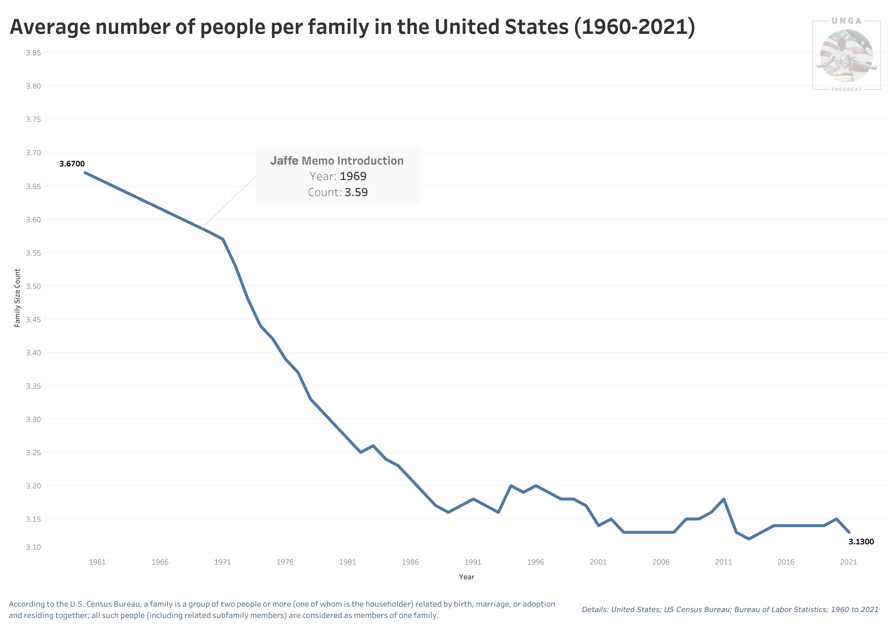 The largest average families can be found in Utah and Hawaii, with an average of 3.61 members. Conversely, the smallest families can be found in Vermont and Maine, with an average size of 2.88 and 2.85 members, respectively.