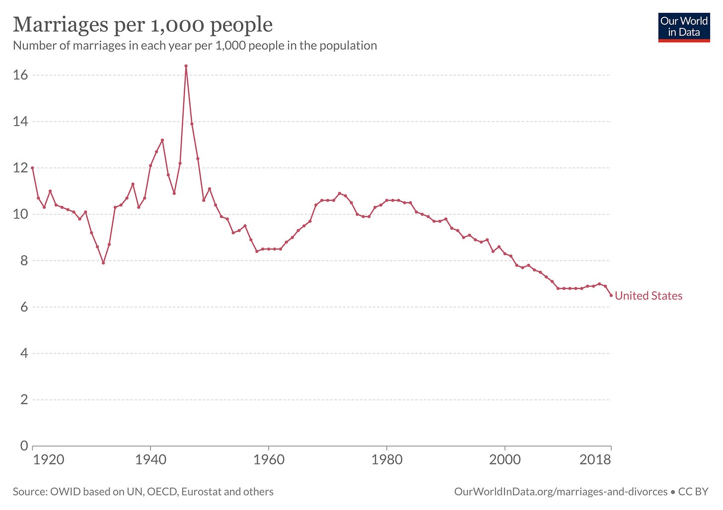 Marriage reduces the probability of child poverty by 80%.” The graph below shows America’s declining marriage rate; considering the benefits mentioned above, this is a big problem.