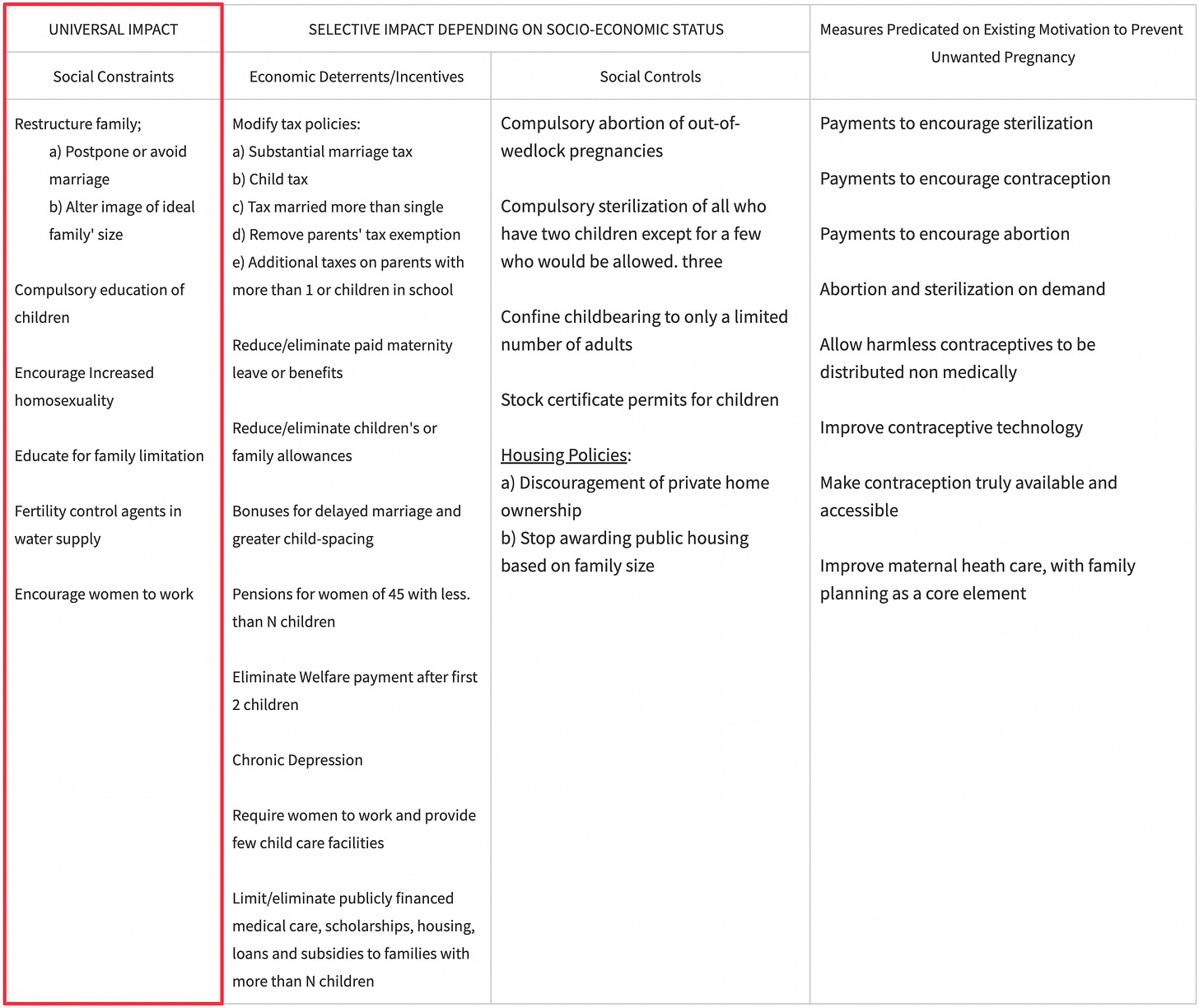 The memo provides the following table of “proposed measures to reduce fertility.” In addition, I have outlined the column “UNIVERSAL IMPACT” and “Social Constraints” to show the reader the data trends that indicate how these recommendations have been and continue to be fulfilled.